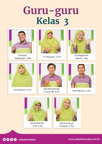 Guru-guru Kelas 3 Achmad Fia Maghfiroh Habibullah, S.Pd Tri Mayasari, S.Pd Sapitri, S.Ag Umi Kalsum, S.Pd Obi Muhammad Furqon Ali, S.Pd Arif Rahman, S.Pd Shofa Mariah Qurrota Ayun Ulfa, S.Pd Hidayat, S. Pd