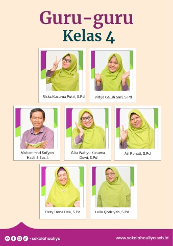 Guru-guru Kelas 4 Riska Kusuma Putri, S.Pd Vidya Galuh Sari, S.Pd Muhammad Sofyan Gita Wahyu Kusuma Ati Rohati, S.Pd Hadi, S.Sos.I. Dewi, S.Pd Dery Dona Dea, S.Pd Laila Qodriyah, S.Pd