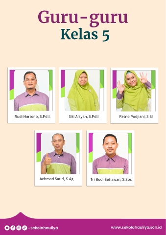 Guru-guru Kelas 5 Rudi Hartono, S.Pd.I. Siti Aisyah, S.Pd.I Retno Pudjiani, S.Si Achmad Satiri, S.Ag Tri Budi Setiawan, S.Sos