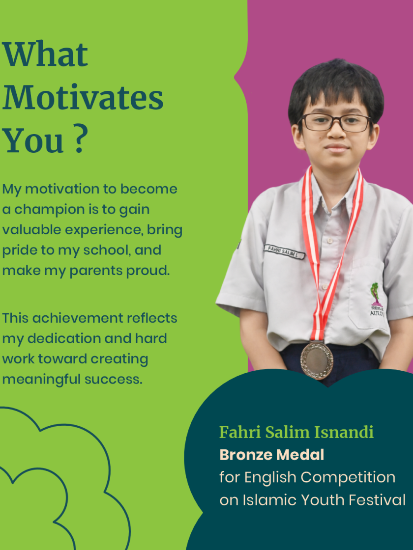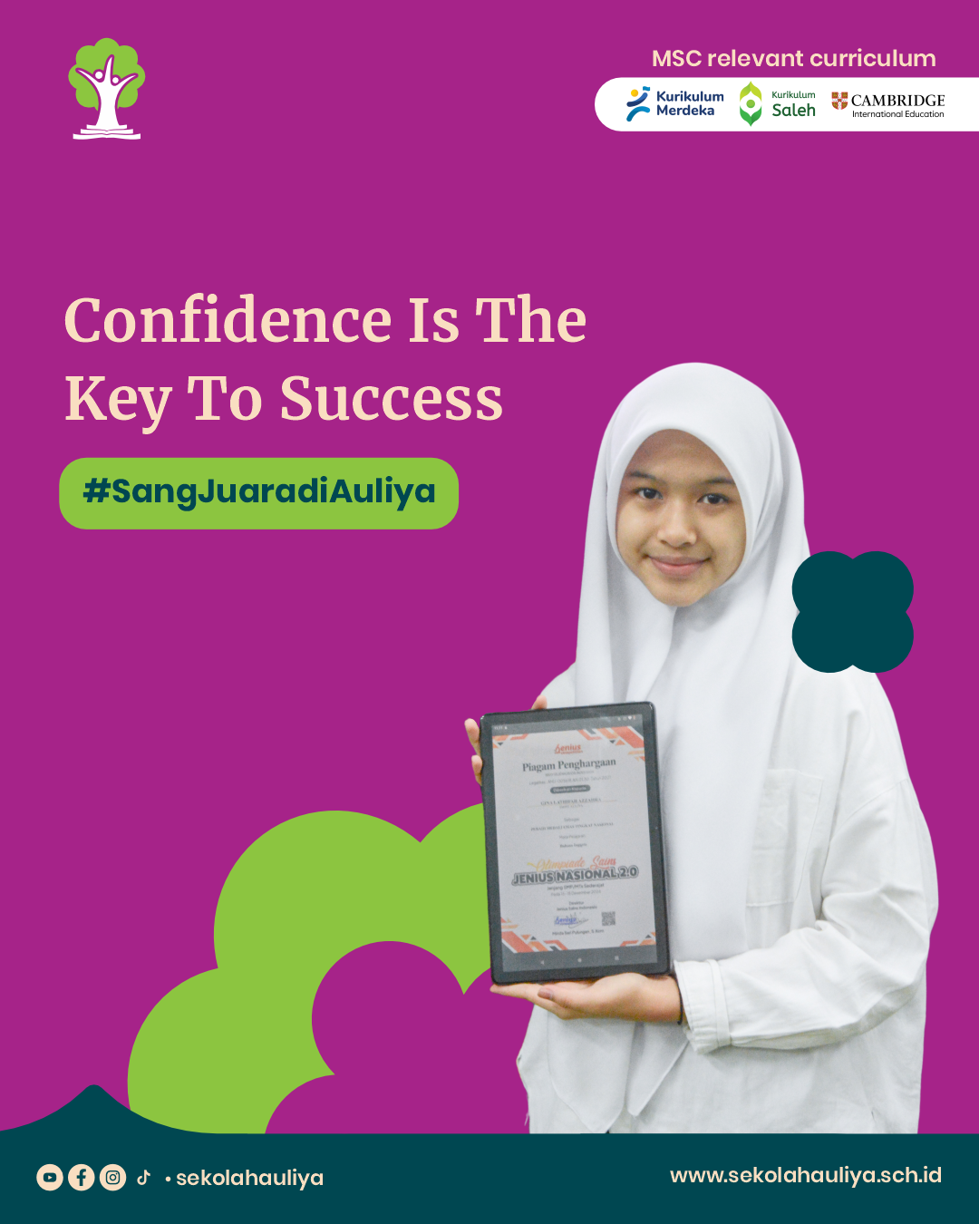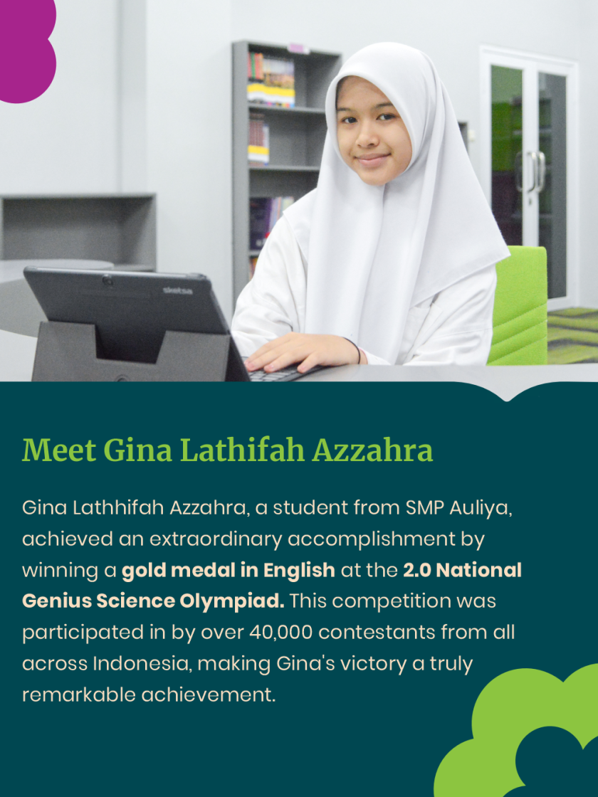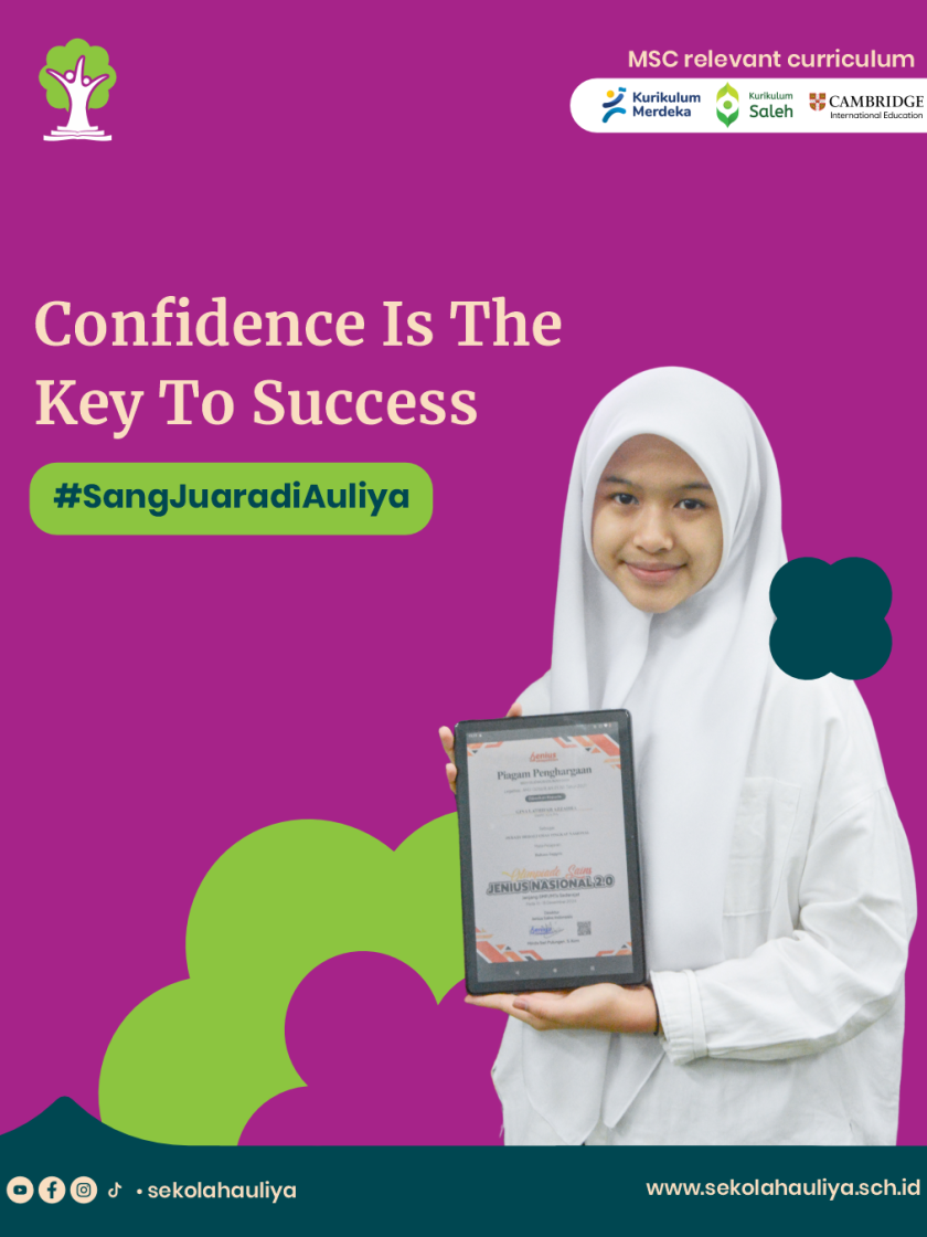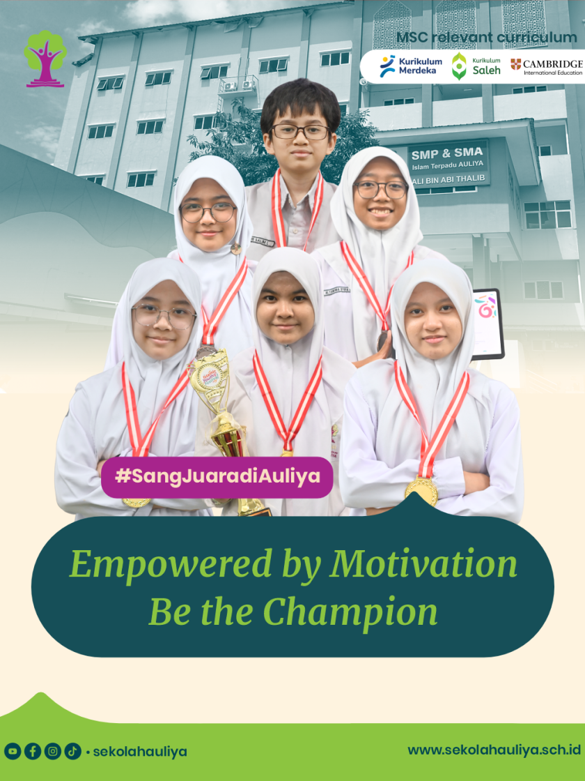 At SMP Auliya, I can freely participate in various activities and competitions, both academic and non-academic, with the support provided by the teachers, even reaching the international level. SMP Auliya also always encourages us to prioritize manners and good behavior so that we can become smart, creative, and righteous students. During my time at SMP Auliya, I feel that my aspirations are more often heard, and I receive a lot of support in engaging in various positive activities. Thank you, SMP Auliya!