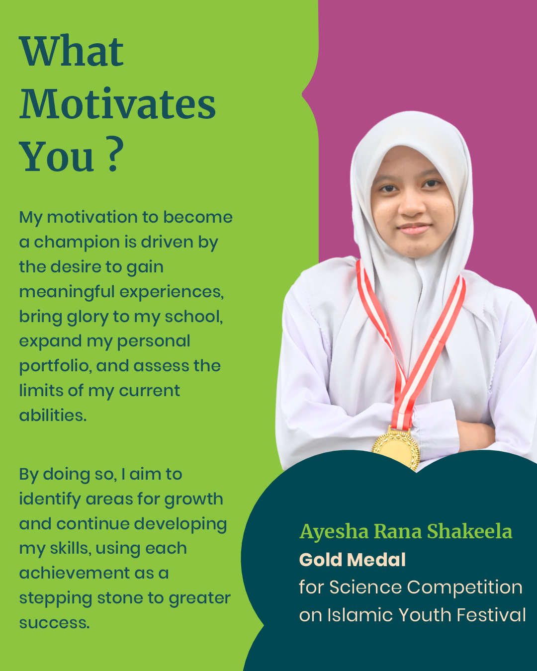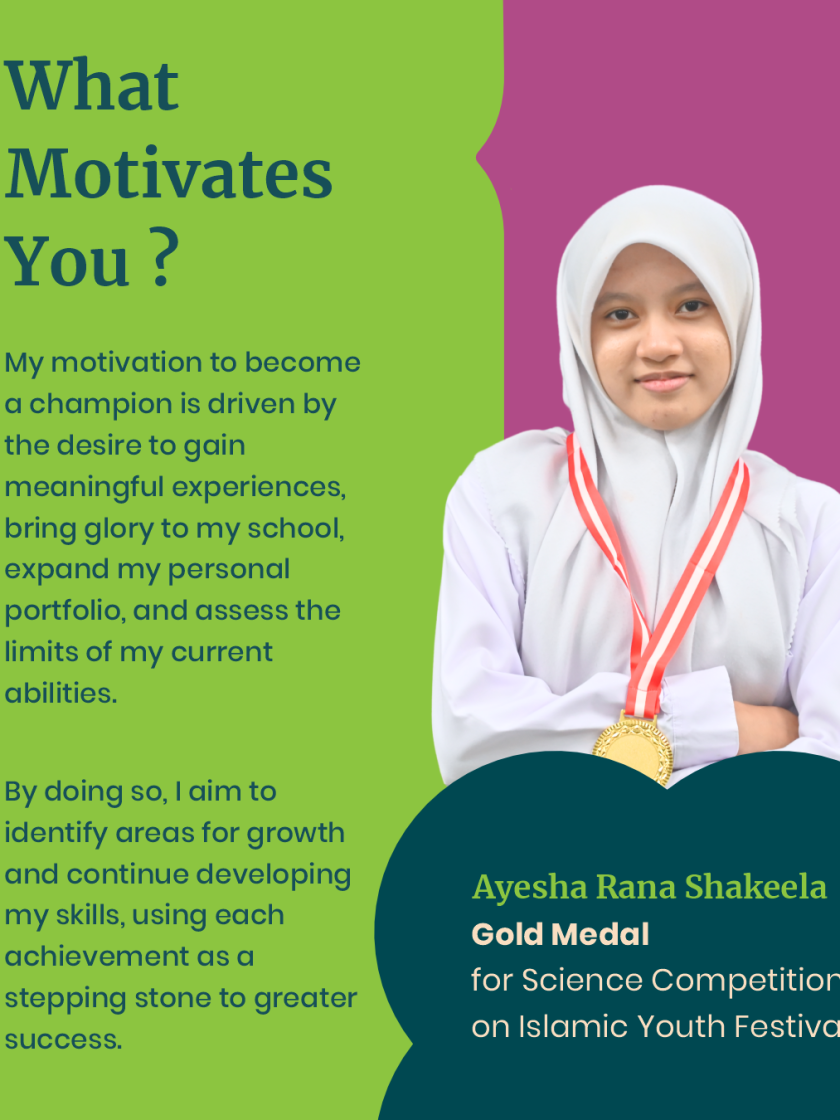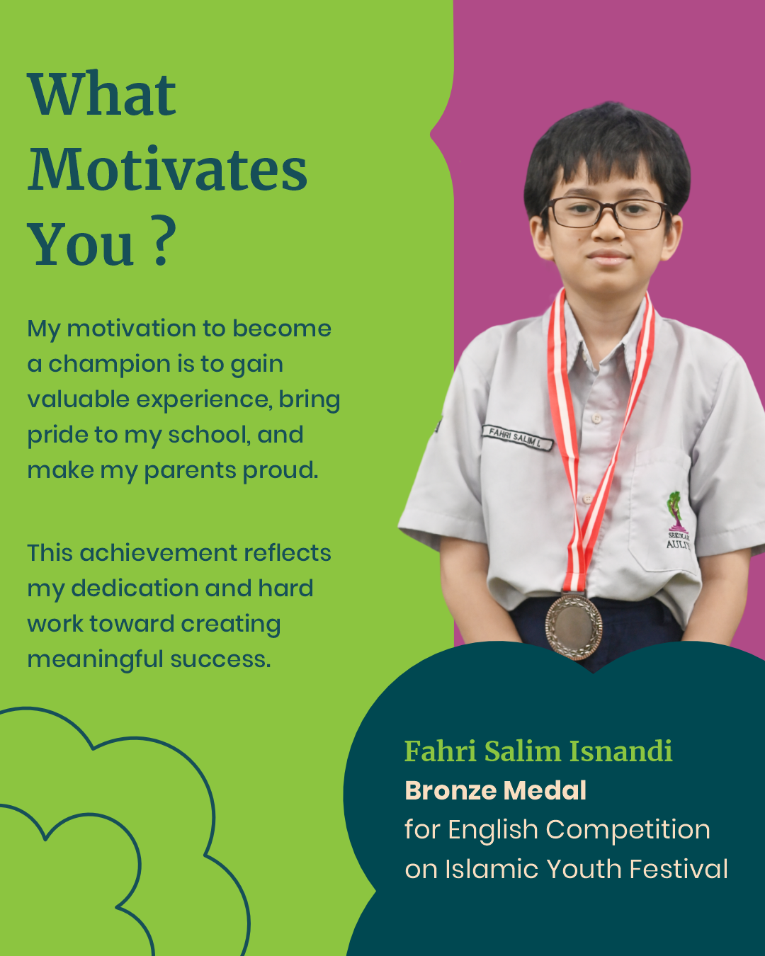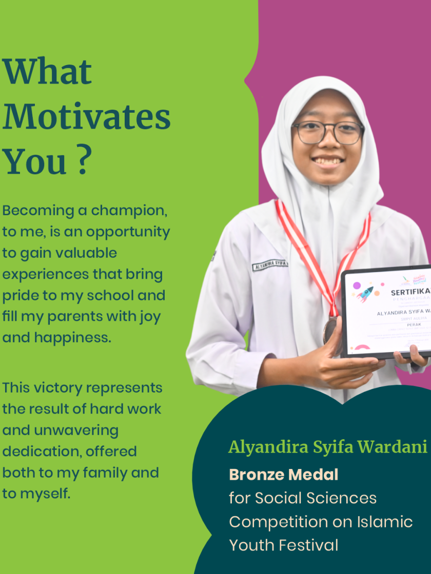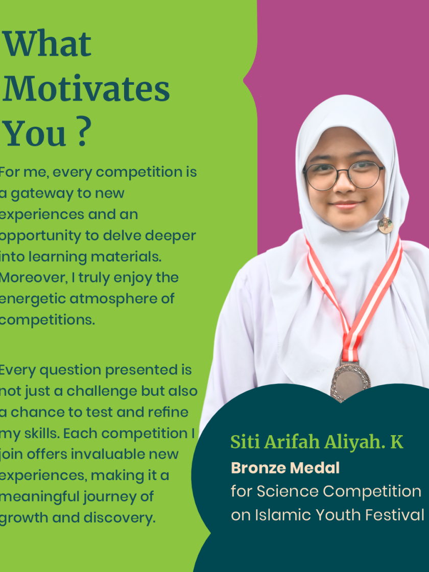 At SMP Auliya, I can freely participate in various activities and competitions, both academic and non-academic, with the support provided by the teachers, even reaching the international level. SMP Auliya also always encourages us to prioritize manners and good behavior so that we can become smart, creative, and righteous students. During my time at SMP Auliya, I feel that my aspirations are more often heard, and I receive a lot of support in engaging in various positive activities. Thank you, SMP Auliya!
